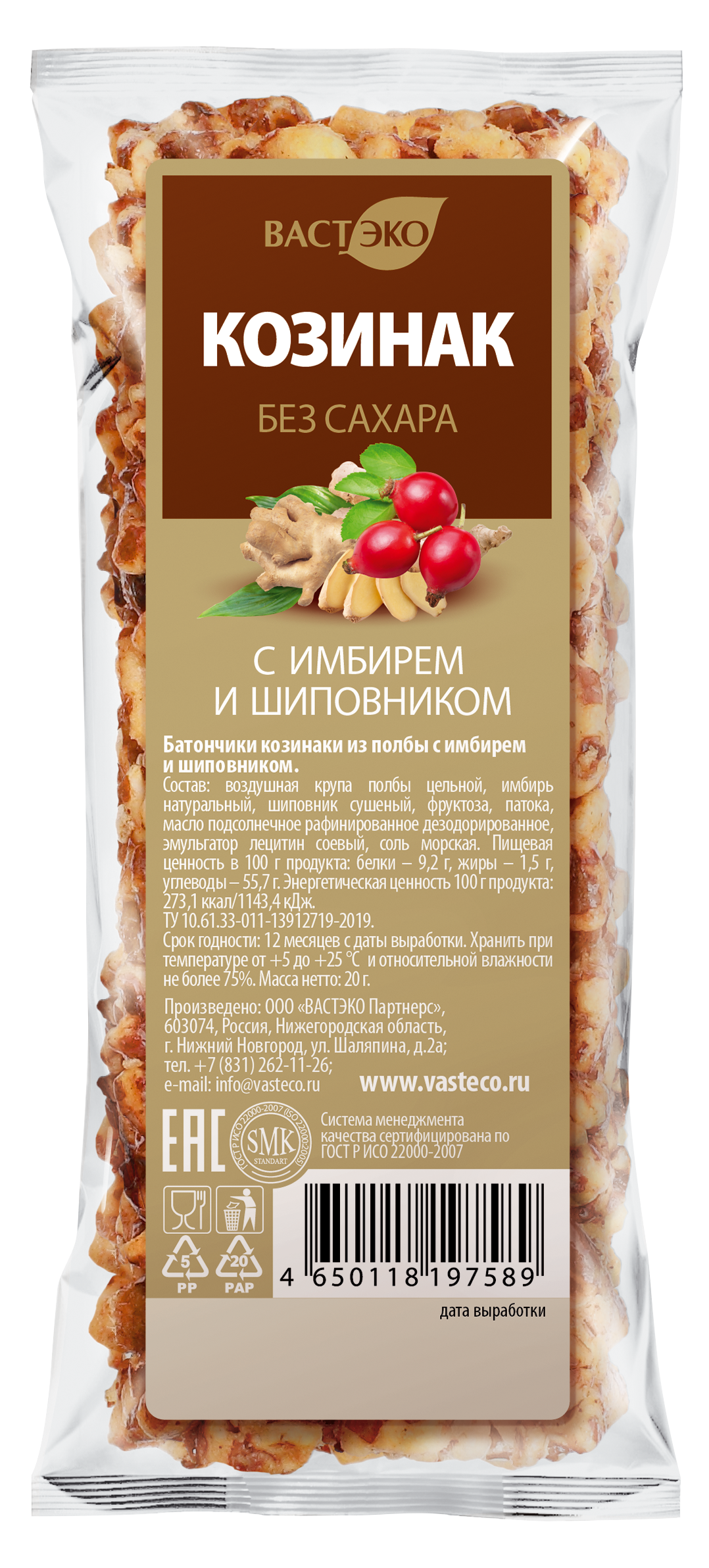 Батончики козинаки из полбы с имбирем и шиповником ВАСТЭКО состав: воздушная крупа полбы цельной, имбирь натуральный, шиповник сушеный, фруктоза, патока, масло подсолнечное рафинированное дезодорированное, эмульгатор лецитин соевый, соль морская — 100% растительный, без сахара, консервантов.